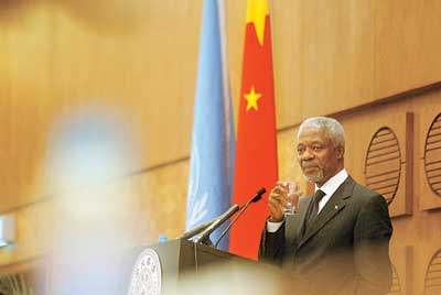 2001年10月,安南獲當(dāng)年諾貝爾和平獎(jiǎng)。安南曾于1997年5月、1998年3月、1999年11月、2001年1月訪華,這次是他第5次訪華。(鄭超)