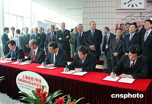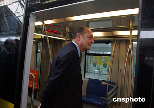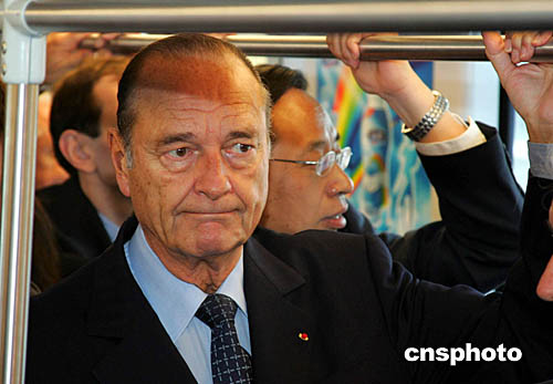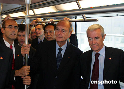 十月十二日,法國(guó)總統(tǒng)希拉克參觀、乘坐上海軌道交通三號(hào)線,并見(jiàn)證“上海地鐵一號(hào)線車輛續(xù)購(gòu)項(xiàng)目合同簽字儀式”。上海申通集團(tuán)有限公司將購(gòu)置一百二十八輛中法合作生產(chǎn)的地鐵車輛,二十二個(gè)月后這些車輛將陸續(xù)投入營(yíng)運(yùn)。作者:潘索菲