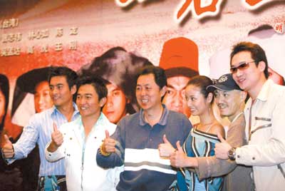 《一石二鳥》是今年明星陣容非常強(qiáng)的賀歲搞笑片。吳宗憲、林心如、雪村、陳龍、吳孟達(dá)、曾志偉、高虎,7位內(nèi)地、香港、臺灣的大腕明星都在片中有精彩表演。正像雪村昨天在發(fā)布會上所說的,這部片子是個純粹的商業(yè)電影,“就是沖著錢去的。”在戲中,本來就有喜劇效果的雪村穿上了難得一見的古裝戲服,頭發(fā)也被設(shè)計(jì)成了雷震子的發(fā)式,更大膽使用鐵鍬作為自己的防身武器,實(shí)在是搞笑得不得了。而吳宗憲更是與林心如大演親熱對手戲。
