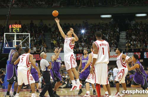 十月十四日晚,首屆NBA中國(guó)賽在上海開賽。在數(shù)萬(wàn)名球迷的擁戴下,小巨人姚明在家鄉(xiāng)“主場(chǎng)”迎戰(zhàn)國(guó)王隊(duì)。最終火箭隊(duì)以八十八比八十六險(xiǎn)勝國(guó)王。作者:湯彥俊