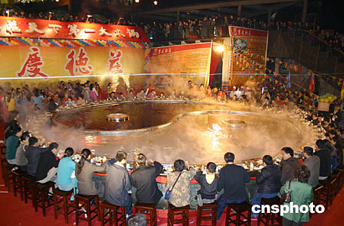 萬人品嘗重慶火鍋活動是第五屆中國美食節(jié)暨首屆重慶國際火鍋文化節(jié)的重頭戲。本屆美食節(jié)組委會成員、重慶市商業(yè)委員會主任秦文武說,來自重慶市的近七十家餐飲企業(yè)聯(lián)手奉獻(xiàn)了九百余桌火鍋。上萬人同席共燙火鍋的壯觀場面,還是有史以來第一次。