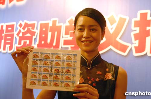 | “神舟”五號(hào)飛船搭載紀(jì)念郵票將于今年年底在成都拍賣(mài),拍賣(mài)所得傭金將全部捐助西部教育事業(yè)!吧裰邸蔽逄(hào)搭載紀(jì)念郵票是隨“神舟”五號(hào)一起遨游太空的唯一三個(gè)整版,中國(guó)航天員楊利偉、聶海勝、翟志剛?cè)嗽卩]票上親筆簽名。圖為禮儀小姐展示其中一個(gè)整版。作者:郭晉嘉