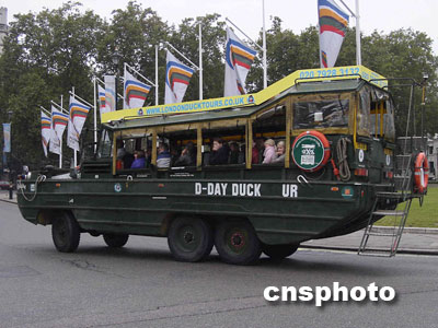 對(duì)游客來(lái)說(shuō),一些造型奇異的觀光車也許會(huì)讓他們對(duì)倫敦這座歷史老城留下更特別的回憶。比如,在大本鐘下,我們?cè)吹皆煨湍7庐?dāng)年諾曼底戰(zhàn)役中盟軍登陸艦的觀光車雄赳赳氣昂昂地駛過(guò)。