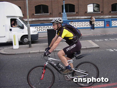 倫敦狹窄的馬路常常并不劃出專門的自行車道,即使有,只是用白線隔出的一條僅容一輛自行車騎行的細(xì)徑。也許是得益于這里良好的交通秩序和公眾的交通意識(shí),人們騎車的速度一般都很快,堪稱“飆車”,雖然沒(méi)見到誰(shuí)出現(xiàn)閃失,但其速度也令記者們暗暗捏一把汗。