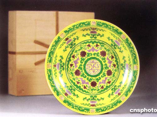 中國清朝乾隆皇帝御制的黃地五福捧壽紋粉彩大盤,如今估計二百萬人民幣以上,將在北京華辰十一月秋季拍賣。作者:賈國榮
