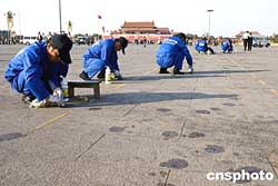10月23日,清潔工人正在北京天安門(mén)廣場(chǎng)對(duì)已經(jīng)發(fā)黑的花崗巖地面進(jìn)行清洗。清洗工作完成后,廣場(chǎng)地面將恢復(fù)淡粉色原貌。清洗工作原計(jì)劃在十天內(nèi)完成,但由于污漬太多,加上清理口香糖等污漬難度大,估計(jì)此次廣場(chǎng)大“洗臉”將會(huì)延期完成。作者:張煒