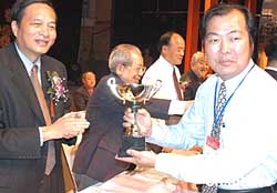 臺(tái)灣中華美食交流協(xié)會(huì)、馬祖餐飲協(xié)會(huì)、金門觀光訪問(wèn)團(tuán),十月二十三日在第十四屆中國(guó)廚師節(jié)暨海峽兩岸美食節(jié)閉幕式上獲得組委會(huì)頒發(fā)的特別貢獻(xiàn)獎(jiǎng)。圖為原中國(guó)商務(wù)部部長(zhǎng)胡平(圖中)、福州市市長(zhǎng)練知軒(圖左一)等為有關(guān)獲獎(jiǎng)代表頒獎(jiǎng)。作者:劉可耕