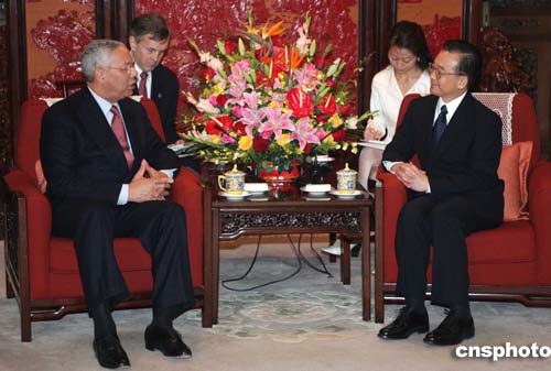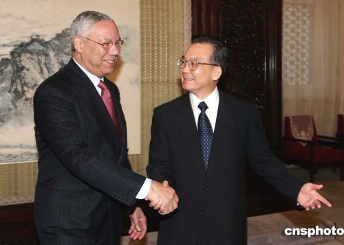 鮑威爾表示,很高興再次訪問北京。他對溫家寶訪問美國記憶猶新。在那次訪問期間,布什總統(tǒng)重新確認了一個中國的政策。