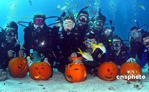 10月25日,在美國(guó)佛羅里達(dá)州25英尺海底上演了一場(chǎng)別開生面的南瓜雕刻大賽,以此迎接即將到來的萬圣節(jié)。Ic/cnsphoto