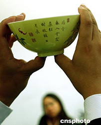 北京華辰十一月秋季將拍賣一件最高品級的清雍正黃地琺瑯彩題詩碗,堪稱收藏界麟角難覓之器,自今難以估價。中新社記者:賈國榮