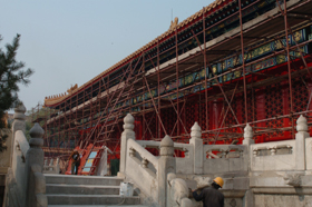 晉宏逵:對于1400名施工人員,一是對這些工人尤其是工長及他們的負(fù)責(zé)人,在進(jìn)入故宮之前都進(jìn)行培訓(xùn),我們叫做持證上崗。二是能夠進(jìn)入故宮的單位都是經(jīng)過招標(biāo)的,它們都擁有國家文物局頒發(fā)的一級文物建筑維修施工和設(shè)計證書。三是故宮和施工單位一起制定了一整套現(xiàn)場管理措施,包括人員、技術(shù)、材料進(jìn)出廠的管理等。通過這些管理手段來保證故宮維修的安全。四是施工單位都是利用傳統(tǒng)方法來進(jìn)行施工的,能夠保證維修工作不改變建筑原狀。另外從技術(shù)措施上,我們也想了很多辦法。比如說對比較重要的墻,他們對每一塊磚都做了編號。在這些建筑隊伍進(jìn)場之前,我們已經(jīng)也做了充分的考慮,不僅僅要保證建筑的安全,還要保證游客的安全,因為我們的維修是在不關(guān)閉多個館的情況下進(jìn)行的,我們劃定了比較嚴(yán)格的區(qū)域進(jìn)行管理。施工工人只在上班時進(jìn)入故宮,不能在故宮居住。