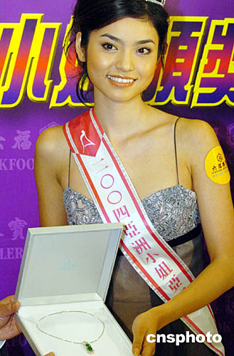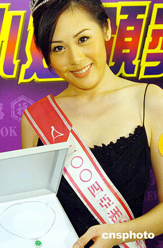 圖為珠寶商向2004年度亞姐競選獲得最上鏡小姐的佳麗黃淑玲頒發(fā)18K白金鑲翡翠及鉆石吊墜。
