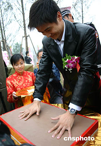 十月三十日,“跳水王子”田亮回到家鄉(xiāng)重慶,成為了重慶奧林匹克花園的名譽(yù)“園長(zhǎng)”。圖為田亮在重慶奧林匹克花園留下自己的手印。作者:郭晉嘉