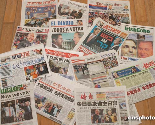 二○○四年十一月二日是美國大選日。當(dāng)天紐約報攤上的英文、中文和其他少數(shù)族裔語種報紙,一律聚焦總統(tǒng)選舉。作者:龔文謨
