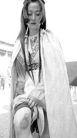 記者來到劇組探班時,正趕上拍攝一場穆桂英在馬上戰(zhàn)群雄的戲,只見王思懿手持長槍躍躍欲試,剛要放馬撒開韁繩舉槍,馬突然驚了,一個加速,把王思懿從馬背上甩下來。劇組工作人員見此狀全都嚇呆了,因為王思懿是膝蓋先著地跌下來,已經(jīng)疼得暈過去。待將王思懿攙扶起來時,她的腿部已根本不聽使喚,沒法走路,在導(dǎo)演、醫(yī)生等簡單處理后,記者才得知,原來思懿左腿膝部完全脫臼,轉(zhuǎn)了180度之后才扳回來。