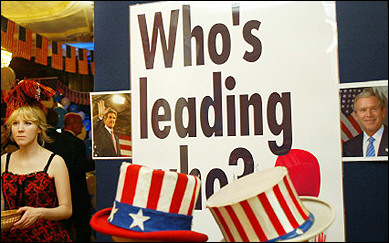 中新網(wǎng)11月3日電,據(jù)法新社報(bào)道 在英國倫敦達(dá)斯茅斯的一個(gè)大學(xué)宿舍里,正在舉行一個(gè)美國大選夜晚會(huì)。晚會(huì)上有一塊宣傳板,上面印有布什和克里兩位候選人的照片,還有一句口號:“誰領(lǐng)導(dǎo)誰?”(固山)