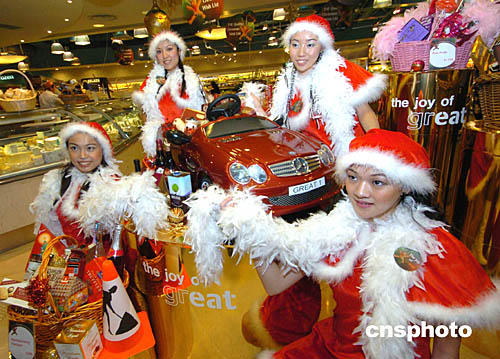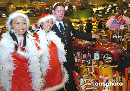 香港一家外國公司11月4日在香港太古廣場由圣誕俏女郎陪伴推出價(jià)值8﹐888元的圣誕跑車禮物籃。