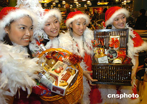 香港一家外國公司11月4日在香港太古廣場由圣誕俏女郎率先推出圣誕禮物籃﹐以吸引消費(fèi)者。作者:趙振清