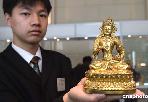 “尊崇之美——佛像藝術(shù)專場拍賣會”十一月六日在北京舉行。由中國嘉德拍賣公司舉槌的這場佛像拍賣會是北京首次舉辦的大規(guī)模佛像拍賣會,共成交一千二百余萬元人民幣,多尊珍貴佛像以高出底價數(shù)十萬元的價格成交。作者:張煒