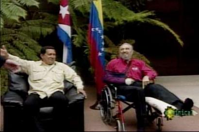 報(bào)道稱(chēng),卡斯特羅與查韋斯在上星期六晚上舉行了長(zhǎng)達(dá)八個(gè)小時(shí)的會(huì)談——這對(duì)于一個(gè)已經(jīng)78歲高齡的老人來(lái)說(shuō)非常不易,考慮到他還剛剛摔了一跤,就更有點(diǎn)難能可貴了。電視臺(tái)的畫(huà)面顯示,卡斯特羅坐在輪椅上,腿打了石膏,胳膊也用吊帶吊在脖子上。此前,卡斯特羅在不慎摔倒后只在電視上出現(xiàn)過(guò)一次。當(dāng)時(shí)電視臺(tái)只播出他胸部以上部分的鏡頭。