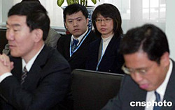 農(nóng)業(yè)部副部長牛盾,十一月十日在北京與臺灣前民進黨主席許信良率領(lǐng)的“兩岸農(nóng)業(yè)交流訪問團”,就加強兩岸農(nóng)業(yè)合作等問題舉行座談。許信良子女(中)亦出席座談會。中新社記者:滿會喬