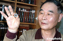 福建省收藏文化研究會名譽會長、福建錢幣收藏第一人欣士敏,十一月十日在福州首次向外界展示一枚清康熙二十七年(公元一六八八年)臺灣錢局鑄造發(fā)行的珍稀錢幣。這枚背面寫有滿、漢文“臺”字字樣的“康熙通寶”錢幣是三百多年前清政府統(tǒng)一臺灣、設置臺灣府的歷史見證。作者:劉可耕