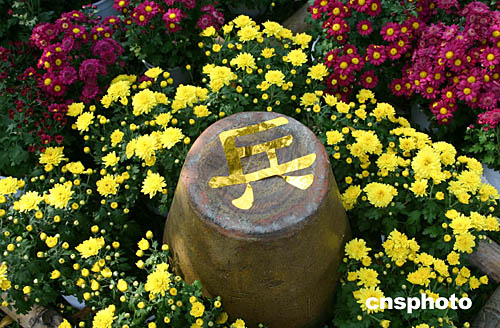 11月12日,臺北菊展在當(dāng)年蔣介石的士林官邸開幕。圖為門前的“棋奕菊間”花區(qū),各色菊花間擺放著中國象棋棋子,創(chuàng)意十足。中新社記者:董會峰