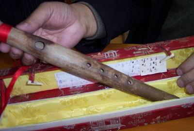 據(jù)收藏者介紹,“這支陶笛為商周時(shí)期文物,中國(guó)目前只有這一支,就連中國(guó)歷史博物館里也沒(méi)有。”記者看到,陶笛長(zhǎng)20多厘米,大小如蠟燭一般。和普通的竹笛不同的是,它不但是陶制的,而且兩端封口,笛筒并不像一般的笛子那樣均勻,而是呈中間大兩端小的形狀。奇特的是,它的氣孔下面只有4個(gè)音孔。主人說(shuō),由于中國(guó)古代的音樂(lè)不成熟,所以管樂(lè)的音孔最早只有一個(gè),后來(lái)到唐代才發(fā)展到了6音孔!澳銊e看只有4個(gè)音孔,但音階很全,古樂(lè)、民樂(lè)都能演奏!闭f(shuō)著,他拿起這支陶笛,吹起了《小河淌水》、《青春舞曲》。聽(tīng)到3000多年前的樂(lè)器發(fā)出迷人聲音,現(xiàn)場(chǎng)的人都陶醉了。