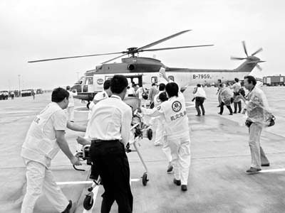 機(jī)場濃煙滾滾,兩輛消防車對準(zhǔn)飛機(jī)噴水,機(jī)組迅速打開艙門,施放緊急滑梯疏散旅客。機(jī)場醫(yī)療急救力量8輛救護(hù)車、60名擔(dān)架隊員也到達(dá)現(xiàn)場,醫(yī)療人員根據(jù)受傷輕重分別在場地上不同區(qū)域插上紅、黃、綠、黑、白五色旗,擔(dān)架隊員抬著擔(dān)架沖向失事飛機(jī)迅速將傷員轉(zhuǎn)離飛機(jī),送往臨時搭建的醫(yī)療驗傷區(qū)。