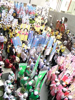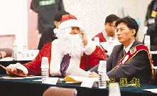 53位臺北縣“立委”參選人17日上午齊聚體育場進行號次抽簽,為了搶鏡頭,各出奇招,有人扮成媽祖、還有人扮成了包青天、圣誕老人。支持者在現(xiàn)場揮舞旗幟、高舉活動招牌,大喊“當選”。