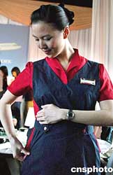 國泰航空18日在半島酒店展示即將更新的員工服裝。國泰航空的機(jī)艙服務(wù)員及香港地勤人員將于明年三月?lián)Q上即日展示的新裝。作者:宋吉河