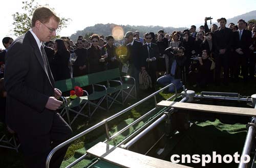 今天的安葬儀式有三百余人出席,中國駐舊金山副總領(lǐng)事邱學(xué)軍專程前往參加并宣讀了彭克玉總領(lǐng)事的唁電,向張純?nèi)绲挠H人表示慰問。彭克玉說,雖未與張純?nèi)缰\面,但早已得知她的作品和事跡。她以正義、勇敢、執(zhí)著、求實的精神揭露了侵華日軍在中國的暴行,還歷史以真實,讓世界了解了南京大屠殺的真相。彭克玉還贊揚張純?nèi)鐬槿A裔的權(quán)益、為增進美國人民對華裔的了解作出了貢獻,是人們永遠(yuǎn)懷念和尊敬的偉大女性。張純?nèi)鐑簳r的伙伴、大學(xué)的好友等也分別回憶了往日與張純?nèi)绲某ο嗵帯?object align="left" classid="clsid:D27CDB6E-AE6D-11cf-96B8-444553540000" codebase="http:///pub/shockwave/cabs/flash/swflash.cab#version=5,0,0,0" height="240" width="320">