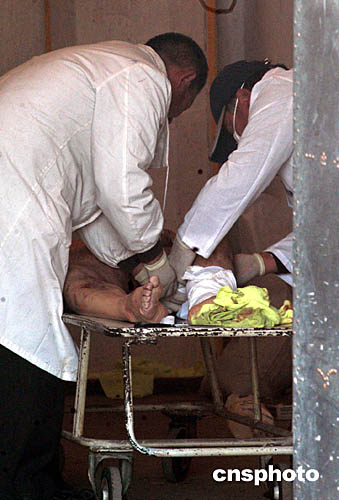 圖為工作人員將遇難者遣體送往停放地點(diǎn)。