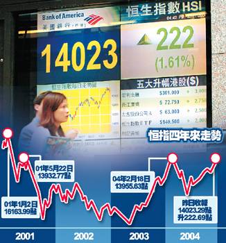 港股今早輕微高開九點(diǎn),恒指開市報(bào)一萬三千八百零九點(diǎn)。后市況反覆向上,升幅不斷擴(kuò)大,至中午收市時恒指已突破一萬四千點(diǎn)。下午,恒指一度高見一萬四千零四十八點(diǎn)。在地產(chǎn)和工商股帶領(lǐng)下,港股以接近全日最高位收市。恒指收報(bào)一萬四千零二十三點(diǎn),升二百二十二點(diǎn),升幅百分之一點(diǎn)六,成交二百六十二點(diǎn)七億港元,比二十二日多了一半。