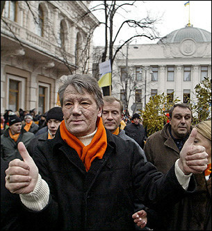 數(shù)以萬計(jì)的示威者一度包圍了總統(tǒng)府,要求允許反對派總統(tǒng)候選人尤申科進(jìn)入。通往總統(tǒng)府的道路上擠滿了揮舞旗幟,并高呼尤申科名字的反對派支持者。