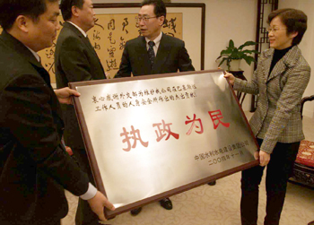 中新網(wǎng)11月26日電 中國外交部副部長武大偉今天在外交部接受了中國水利水電集團(tuán)公司贈送的“執(zhí)政為民”匾牌。