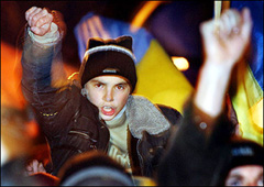 烏克蘭議會27日舉行緊急會議,會議的過程通過電視向全國作實況轉播,在議會大樓外面聚集的人群也在大型屏幕上觀看投票的過程。多數(shù)議員投贊成票通過了這項決定。投票時有大約100票棄權,只有1票反對。