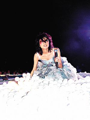 王菲的演唱會(huì)不會(huì)有變化多端的舞蹈或性感,但這晚她興之所至唱《精彩》時(shí),赤腳跑到臺(tái)前的“波波池”玩,更把白色波波拋給觀眾,自己又因?yàn)檎静环(wěn)兩度跌在池中,還開心地大笑,有如一個(gè)小朋友般頑皮。同時(shí)臺(tái)上又出現(xiàn)了漫畫版的王菲,這段漫畫是代替了之前一段讀白,因?yàn)槊看尾ネ暝撈味甲屓苏`會(huì)她打算退出,故主辦單位決定換掉。熒幕上出現(xiàn)的漫畫版王菲,肥肥白白,因?yàn)椤鞍⒎啤币幌蚨伎释约嚎梢耘忠稽c(diǎn)。演唱會(huì)以《人間》一曲結(jié)束,雖然歌迷熱情地大叫安哥,但向來沒有安哥習(xí)慣的她,以超過五分鐘的時(shí)間向觀眾深深鞠躬,代表了她對(duì)歌迷的謝意。