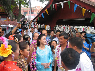 29日一早,在舞獅及具馬來特色的舞蹈的熱烈歡迎下,“鳳凰號”船員乘坐擺渡船緩緩航行到達紅屋碼頭。馬來西亞、印度裔及華裔少女身著特色服裝為這3位乘風破浪的“鳳凰號”英雄們獻花致敬。隨后,搭乘花車到達慶祝儀式現(xiàn)場。在鳳凰衛(wèi)視主持人薩文和2004年度中華小姐大賽冠軍李詩琪的主持下歡迎儀式正式開始。