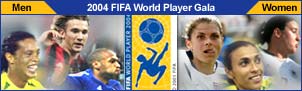 國際足聯(lián)公布的2004年世界足球先生的最終3名候選人是:法國的亨利(英超阿森納俱樂部)、巴西的羅納爾迪尼奧(西班牙巴塞羅那俱樂部)和烏克蘭的舍甫琴科(意大利AC米蘭俱樂部)。