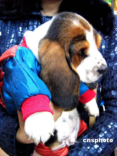 11月29日,在南京夫子廟寵物市場(chǎng),一條名為巴吉度的德國犬種寵物狗身穿面料考究、做工精良、款式新穎的小棉襖和背帶褲由主人抱著逛市場(chǎng),一幅悠閑自得的模樣。孫忠南 攝