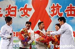 十二月一日,中國內(nèi)地演員濮存昕(右一)、蔣雯麗(左一)在“關(guān)注婦女,抗擊艾滋”活動(dòng)上,與來自四川資中公民鎮(zhèn)的艾滋病毒攜帶者同臺(tái)獻(xiàn)藝,該艾滋劇團(tuán)是由四川資中縣近二十名艾滋病感染者自發(fā)組建的。作者:韓藝冰