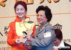 香港影視紅星楊千嬅12月1日出席“世界愛(ài)滋日展覽”活動(dòng),接受特首夫人董趙洪娉贈(zèng)送紀(jì)念品,楊千嬅作為聯(lián)合國(guó)艾滋病規(guī)劃署香港大使,獲得公眾投票選舉為最高的難忘人物。作者:洪少葵
