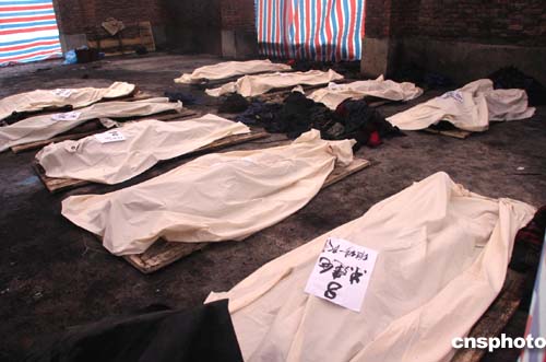 | 十二月一日,陜西銅川礦務(wù)局陳家山煤礦救險(xiǎn)指揮部確認(rèn)井下礦工已經(jīng)沒有生還的可能,可以確認(rèn)全部遇難。當(dāng)日,有關(guān)部門在礦區(qū)一處偏僻地搭建臨時(shí)停尸棚,凌晨首批升井的遇難礦工遺體安置在這里,準(zhǔn)備讓家屬認(rèn)領(lǐng)善后。作者:任晨鳴