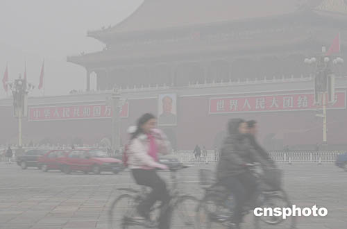 十二月二日清晨,北京天安門城樓和長安街籠罩在濃重的霧氣當(dāng)中。北京連日來遭遇大霧天氣,首都機(jī)場眾多飛機(jī)航班延誤,京開、京沈、京津、京石等高速公路相繼關(guān)閉,城市道路能見度降低,交通事故明顯增多。中新社記者:毛建軍