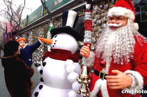 十二月初,在酒吧林立的北京三里屯,商家提前請出圣誕老人招徠顧客。作者:張煒