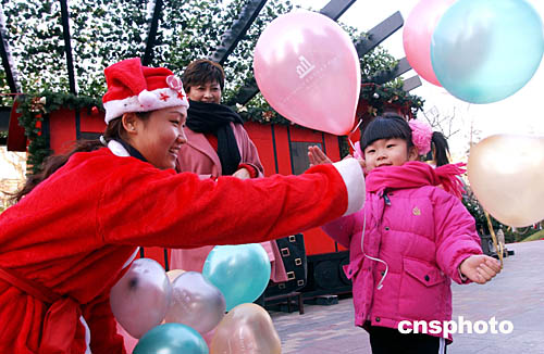 十二月五日,北京一家商場(chǎng)把公司員工打扮成圣誕老人的模樣為過(guò)往顧客派發(fā)圣誕禮品和氣球,以此招徠顧客。作者:韓藝冰