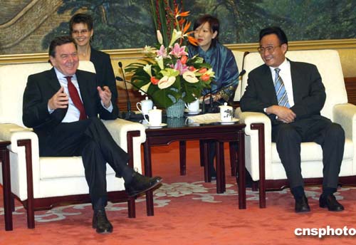 施羅德贊同吳邦國對德中關(guān)系的評價。他說,中德關(guān)系建立在相互信任的基礎(chǔ)上,各個方面的合作都很好。德國政府重視德中關(guān)系,將繼續(xù)堅持一個中國政策。德方愿進一步加強兩國議會業(yè)已存在的良好合作關(guān)系。同時,愿繼續(xù)加強與中國的民間交往,以及文化交流。德方愿與中方一道使德中關(guān)系始終保持高水平的發(fā)展。