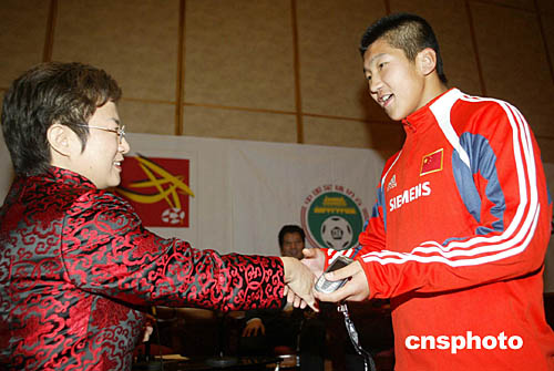 | 十二月七日,中國(guó)之隊(duì)主贊助商西門子有限公司在北京為即將踏上征途的“08之星足球隊(duì)”餞行,“08之星足球隊(duì)”的全體隊(duì)員以及中方教練共三十二人以及中國(guó)國(guó)家男子足球隊(duì)隊(duì)長(zhǎng)李瑋鋒、中國(guó)足協(xié)青少部官員、西門子公司代表參加了此次活動(dòng)。來(lái)自西門子公司奧運(yùn)項(xiàng)目部部長(zhǎng)張芳(左)在餞行儀式上向球隊(duì)的每個(gè)隊(duì)員贈(zèng)送一部西門子手機(jī),祝愿“08之星”一路順風(fēng)。中新社記者:盛佳鵬