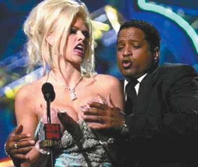 VH1音樂(lè)頻道2004頒獎(jiǎng)晚會(huì)日前在洛杉磯舉行,安娜·尼科爾·史密斯也應(yīng)邀參加,不知為何,當(dāng)她走到舞臺(tái)上后,突然脫去了裙子,露出了自己的雙乳,及時(shí)趕到的保安用手盡量遮擋住她的乳房,強(qiáng)行將她拉到了后臺(tái)。據(jù)一位觀眾說(shuō):“當(dāng)時(shí),史密斯看起來(lái)非常興奮,就在她脫裙子的一瞬間,一名保安把她拉到了后臺(tái)!笨墒,到了后臺(tái)后史密斯仍然不老實(shí),她甚至想讓攝影師給她拍裸照。前不久,史密斯在參加美國(guó)音樂(lè)頒獎(jiǎng)晚會(huì)時(shí),也因精神恍惚、吐字不清令觀眾無(wú)法聽(tīng)懂她在說(shuō)什么,還一度趴在臺(tái)上睡覺(jué),結(jié)果主持人打斷了她的講話,將她請(qǐng)下舞臺(tái)。有消息說(shuō),她當(dāng)時(shí)要么是喝醉了,要么就是受到了吸毒的影響,但她的律師解釋說(shuō),由于這位名模的視力不太好,所以無(wú)法看清自動(dòng)提詞機(jī)上的文字。